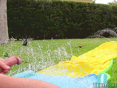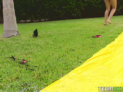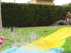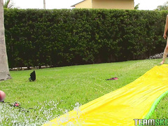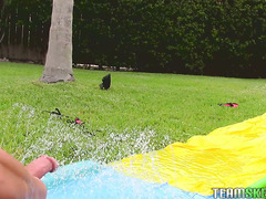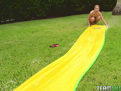 Tiny teen blonde Goldie Ortiz is having some slip and slide fun down in Miami in our yard. On her first try, she goes all the way, and slides to a fat cock and gives a hot oral blowjob on her tummy.