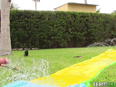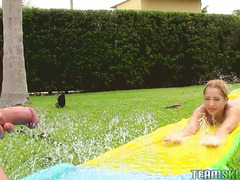 Tiny teen blonde Goldie Ortiz is having some slip and slide fun down in Miami in our yard. On her first try, she goes all the way, and slides to a fat cock and gives a hot oral blowjob on her tummy.