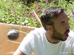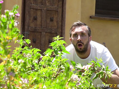 It's a hot day, and Angelica Taylor was working towards a golden brown tan when she got the idea cool down. She grabbed her garden hose and started spraying cold water all over her curvy body and busty tits. Keiran Lee was watching all of this, and took the chance to move in closer.