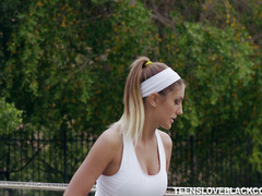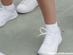 August Ames is outdoors with her black partner and she is doing some foreplay. The sexy thing is playing tennis with the dude and she is doing some sexy moves. She knows how to turn on her lover by shaking her ass.