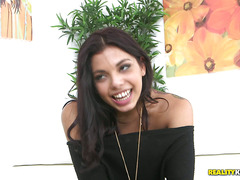 Gina Valentina is smiling and talking sexy in front of the camera. The Brazilian woman lifts up her dress over her chest and she reveals her small tits with large nipples. They are quickly becoming hard as she is doing the flashing.