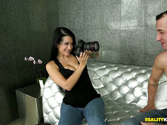 Katrina Jade gets some pictures taken of her as she is undressing. The photo session turns her on and after she slowly removes her bra and her panties she starts moving closer to the guy taking pictures of her flesh