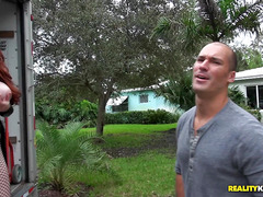 Big tits redhead Veronica Vain flashes furniture movers in public