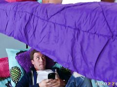 Cali Carter is rubbing her clit in front of the camera in the solo scene. Her friend catches her doing it and it turns him on. He also stares at her large tits and her prominent nipples that are really aroused.