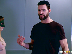 Cassidy Banks and Kenzie Taylor are in a line up with some other girls in the police station and they are wearing their masks. The guy has to pick out the one that mugged him out of the line up by recognizing her by her tits.