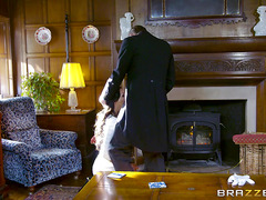 Patty Michova is on her knees and she is giving a blow job to the butler. She has to play around with him since her old husband cannot get it up as often as she would like it. The guy watches her performance since he is a cuckold.