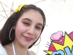Barely legal brunette whore Lucy Doll sucks a dong and rides it later