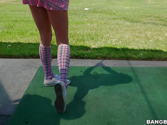 Karla Kush is with her golf instructor in her short skirt and he keeps touching her on the golf course. He ends up grabbing the little vixen and he shows her how to swing the golf stick while pressing himself against her.