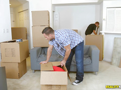 Jacob was moving to a new place all on his own and his girlfriend and dad were along to help him. Olivia was really concerned about being so far away from him but Jacob was too busy moving all his things to even pay attention to her. He was so in his own little world that he never noticed her all over his dad when he would leave the room. His father was shocked at first but soon gave in to Olivias seductive, flirty ways. Before long, he was making out and sucking her perky tits while hiding behind moving boxes. Jacob was to consumed with getting all his gear in his room to notice that his girl was choking and gagging all over his fathers cock. These two went at it every which way, ducking away from her loser BF every time. He only came to realize something was up when he stumbled into her on her knees covered in man juice.