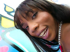 Ebony babe Sarah Banks sports braces, a bubbly booty and a spunky style. The mocha-skinned slut strips and poses for director Mike Adriano. She gives a lewd, sloppy blow job with intense deep throating. The pervy director lubes up his thick prick and pries open Sarah's sweet sphincter. Cute Sarah twerks on Mike's big boner, her plump rump wriggling with every thrust. Sarah gushes spit as she lewdly sucks cock ass-to-mouth, and she swallows down a healthy helping of hot splooge.