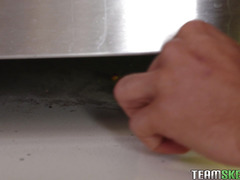 The clumsy Dylan accidentally ped his memory card under the stove. His hands were way too big to grab it out. Luckily, he called his sweet and petite neighbor Morgan over to lend a helping hand. Her incredibly slender arms were able to slide under and reach it no problem, but her skimpy skirt was riding up and exposing her perfectly sized ass. Dylan tried to be slick and take a few pictures for his spank bank, but got caught just the last shutter closed. Morgan thought that was pervy, but continued to help him look. She finally grabs it. Dylan is so thankful, but he wishes he had a tiny cutie her around the house all the time to help with other things. Morgan wonders what they could be, and Dylan immediately places her hand on his cock. Morgan proceeds to suck his massive wang and get fucked all over the kitchen.