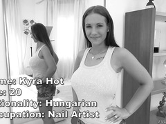 Buxom Kyra Hot's tight top and short shorts reveal a busty figure with thick, tan legs. Auditioning for porn icon Rocco Siffredi, the Hungarian hottie strips down. She slurps Rocco's enormous penis and then swaddles the jumbo boner between her jugs for a hot titty fuck. Kyra holds the camera while the thick-dicked stud drills her cunt, and she enjoys an intense cock ride. Finally, the sex-addled slut deep-throats Rocco's rod, and he dumps his jizz into her hungry mouth.