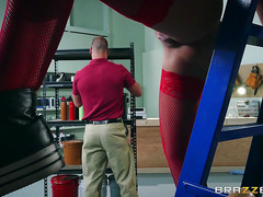 August is a sexy stock girl who needs help placing items on higher shelves. She enlists the help of the only other person in the store: a shy, young, male employee who can't stop staring at her big natural tits and sexy thigh high stockings. When she catches him peeking up her skirt August decides to have a little flirtatious fun with him, eventually fucking him right there in the store.