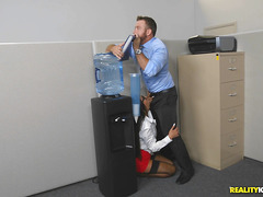 The big boss brought his insanely hot daughter to the office since she was going to start working there. He called Chad in to show her around the office and introduce her to the staff. This hottie was already licking her lips and making gestures at Chad while her Dad was talking to him. So he took her around the office to show her the ropes. When they went by the water cooler, she cornered him and told him she was gonna get back at her dad for this shitty job by fucking everyone in the office. Chad in shook, tried to stop her but she just dropped down to her knees pulled his cock out and started going to town. They almost got caught several times but Chad managed to block her from view every time. Her Dad even came by to tell him to come to the meeting while he was balls deep in his daughter.