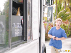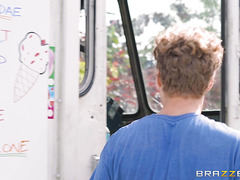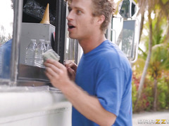 On a slow day working the ice cream truck, Jade decides to have some fun with the merchandise, rubbing a sweet cold treat on her pussy. Customer Michael comes by and is shocked to find the hottie masturbating, but horny Jade makes him a deal - she'll fuck him if he buys enough ice cream to meet her daily quota. Can she serve hungry customers while hiding that she's being nailed from behind?