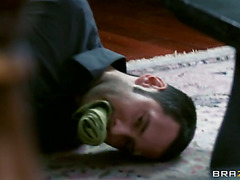 Busty milf Ava Addams gets two boners to salute her curvy body and goes to work on the stiff shafts. She gets ass and pussy fucked at the same time with a double penetration while her tied up husband watches on in horror.