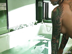 Curvy raven honey Christy Mack bends over her bathtub in black stockings and lets her lover nail her as hard as he wants. Her grabs her from behind, by the hips to split apart her yummy pussy lips that ooze with juices and pulsate with pleasure.