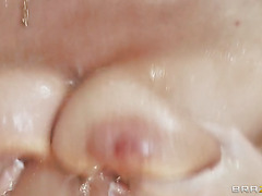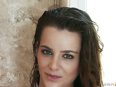 Hot brunette Natasha Nice hops into the shower but gets carried away after a few moments with her juicy tits. She licks her nipples and kisses her tits while showing off her arousing body. This floozy can't go without fooling around whatever she's doing.