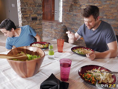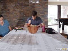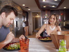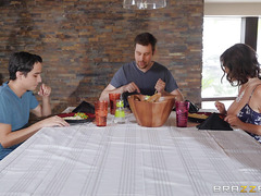 Krissy Lynn’s son has had some trouble making friends, but he seems to have connected with Ricky Spanish, who has come over to hang out and is staying for dinner. When Ricky goes to find the bathroom to wash up before dinner, he stumbles upon Krissy and catches a quick glimpse of her tits, which makes him realize he needs to see more. Fortunately for Ricky, dinner provides ample opportunity thanks to Krissy’s revealing wardrobe, not to mention her clear interest in getting her hands on Ricky’s cock.