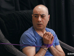 The sinfully sexy Abella Danger convinces her husband to let himself be tied to a chair for some kinky fun. Things look promising at first, with Abella giving her restrained husband a hot lap dance, but soon the poor man realizes that tonight isn't about his pleasure. Abella invites stud Manuel Ferrera into the bedroom and the two fuck right in front of her husband... all in good fun.