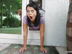 Stuck and fucked in a doggy door, really? The ever-horny Nadia White snuck into Jax Slayher's home just to get lusty on his couch and masturbate like no one's watching. The only problem is that someone is, indeed, watching. When Jax catches Nadia red handed, she only has one thing in mind: flee. Now she's trapped in the doggy door, her eager asshole banged by Jax on one side, and her face fucked by Tony Rubino on the other. And you know what? The whore loves it!
