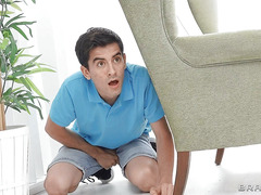 Sapphire Lapiedra is shopping for new furniture at Amy Amor's store, and as we soon find out, Sapphire has a very particular way of testing out her potential new purchases! While Amy is at the computer looking through her inventory, Sapphire grinds her sweet ass and pussy on a clear table, wanting to make sure it's sturdy and comfortable to fuck on, of course! Enter Jordi, who can't believe his eyes when he sees a gorgeous babe, tits out and getting herself off. He peeps on Sapphire, and when Amy sees what her customer is up to, things get really wild as the two engage in lesbian sex. Jordi can't contain himself, jerking off and cumming on a sofa, until he is caught by the angry and horny store owner! Amy and Sapphire pull him into an intense threesome, oiling up their titties and smothering Jordi's face with them, fucking him in every which way until they're left covered with his cum.