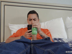 Uptown Jenny is tired of Juan Locoís jerky ways. She would have never moved in with her new hubby if she knew his adult son was such a dirty mess! When Juan stands off with her over some spilt milk, Jenny lets her hubby know that if he doesnít stand up to Juan, her booty will be on permanent lockdown. Jenny goes to the bedroom alone to prove her point, and to play with herself and her toy ribbed glove. Meanwhile in the next room Juan is rocking his cock rocket so hard heís shaking shit in Jennyís room! Pissed and horny, Jenny pervs on Juan and gets up close and personal with his cock right as he reaches blast off. Impressed with his load and his size, she decides the only way to deal with this dick is to fuck some sense into him.