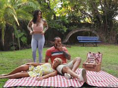 While jogging in the park, Keisha Grey spots a handsome guy (James Angel) sharing an intimate moment with his girlfriend (Vivianne DeSilva) on a picnic blanket ó she's sucking his cock! Keisha secretly captures the moment on camera, realizing she wants that cock too! When Vivianne falls asleep in James' lap, Keisha decides to lure him. She trots by, jiggling her bare asscheeks and tits to get his attention. She's successful! Without waking Vivianne, James slinks to a park bathroom where Keisha's knuckle-deep in her own glistening pussy. A spirited round of hard-core, tights-splitting anal sex intensifies her activities before Vivianne eventually wakes up. Vivianne tries to locate her man before finding him in the bathroom with Keisha. The cum-covered couple welcomes her with a cheeky display!