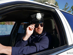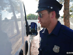 Kaiia Eve is out for a leisurely bike ride when she parks her bike right behind the van Rocky Emerson is about to steal. Rocky quickly puts the van in reverse, rolling over Kaiia's bike. Kaiia, pissed, approaches Rocky to confront her and instantly realizes that she's in over her head. Rocky discovers Kaiia's bag full of sex toys and decides to take Kaiia into the back and teach her how to squirt using her whole fist. When a cop, Kyle Mason, shows up, Rocky uses a strap-on intimidation tactics to get Kyle's cock out and into the mix. Kyle forgets about his civic duty and only thinks of cumming in both the egar and open mouths of these bad ass babes.