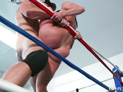 Milf mistress Kendra Lust didn't get a piece of this pro wrestler's dick last night and she'll be damned if she doesn't get it today. Storming into his gym she strips her clothes in an instant and gets slammed hard against the ropes with her huge tits out.