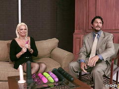 Tommy Gunn welcomes America's most well known sex threrapists Rhylee Richards to his talk show and starts the interview with a dozen sex toys. Rhylee has a hands on approach unfit for daytime tv but Tommy is way ahead of her with dildo in hand.