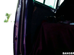 Brunette dream girl Aletta Ocean wanted to do something different, so she climb aboard a van and started fooling around with a hot young guy. He teases his hard cock with her big fake tits and luscious ass, they fucked liked beasts and he came all over her boobs.