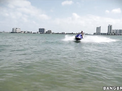 Nikki Benz was having a tough time keeping her big enhanced tits inside her bikini while whizzing about on a jet sky so she whipped those beauties out and got her tan on while showing off her beautiful body.